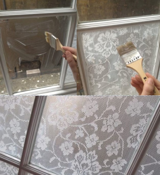 Ето какво ви би трябвало: ажурна дантела, 2 супени лъжици царевично нишесте, 2 супени лъжици студена вода, чаша и половина вряща вода, ножици, четка. Изберете красива и деликатна дантела. Изрежете правоъгълно парче с размера, който желаете. Направете сместа с нишестето. Първо го разтворете в двете супени лъжици студена вода. После тази примес разтворете във вряща вода – чаена чаша и половина. Водата би трябвало да заври и да се отмести от котлона преди да изсипете вътре нишестето. С помощта на четка нанесете пълен пласт от получената паста от нишесте по стъклото.