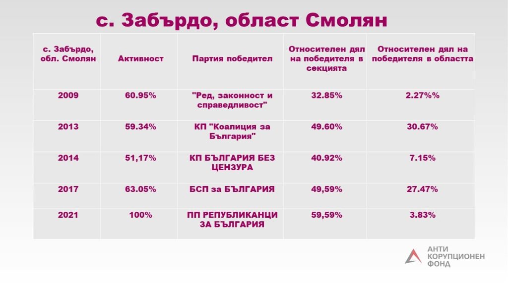 ” Докато специалистите ни работят върху разбора на размера и смисъла на следения избор на изборите от 4 април 2021, ще ви представяме някои от най-интересните секции ”, оповестяват от Фонда и стартират поредицата си със село Забърдо , област Смолян.