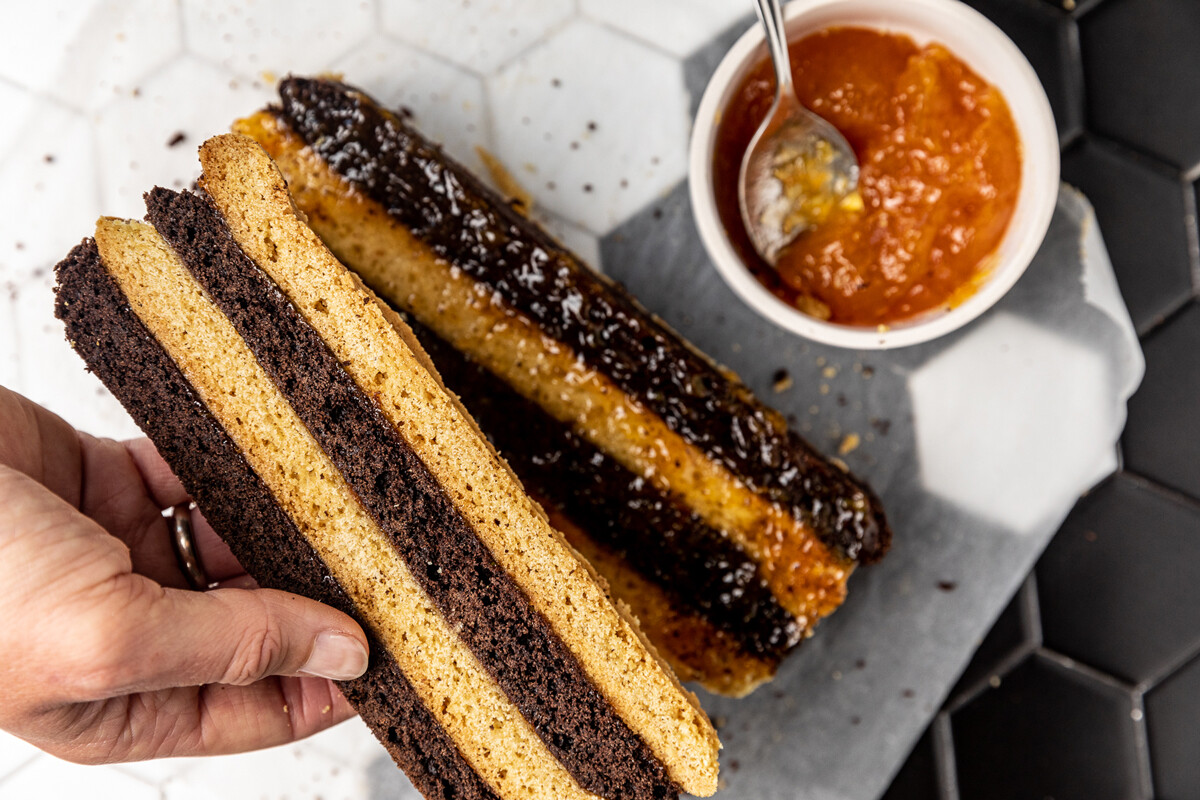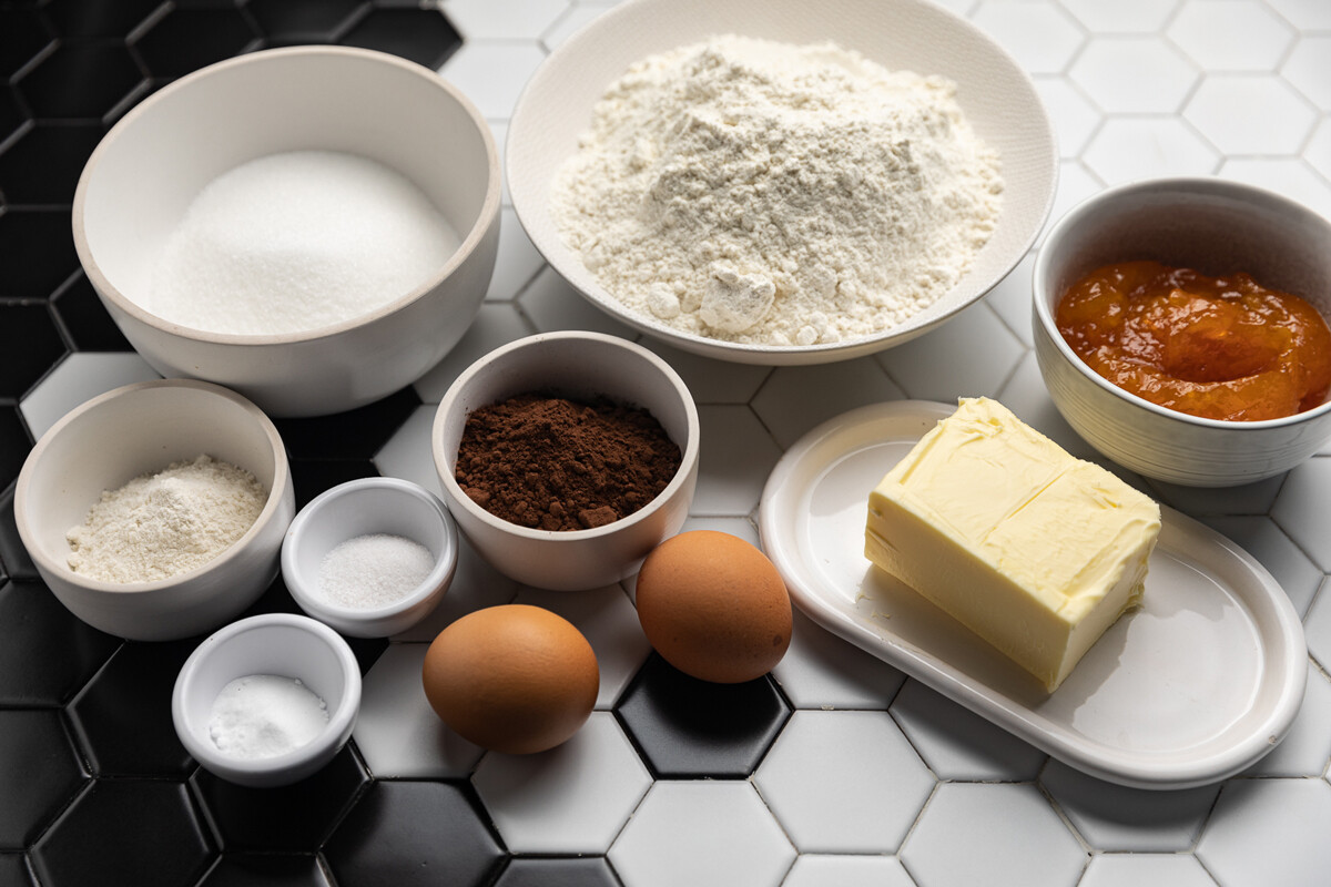 Брашно – 375 г + 25 г за ваниловия слойЗахар – 200 гМасло – 200 гЯйца – 2 бр.Какао – 25 гВанилова захар – 1 ч.л.Бакпулвер – 10 гСол – 1/3 ч.л.Сладко от кайсии – 400 гПриготвяне: