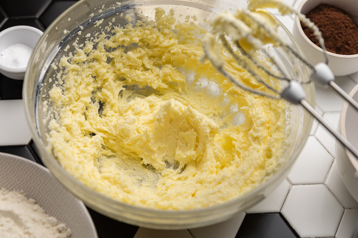 Всички съставки би трябвало да са на стайна температура. Разбийте маслото със захарта и ваниловата захар в продължение на пет минути. Масата би трябвало да усили размера си и да олекне.