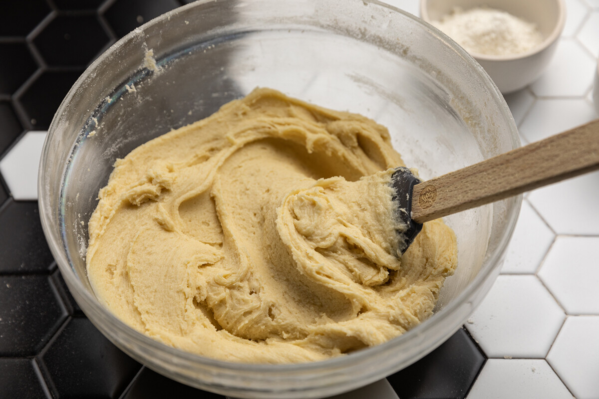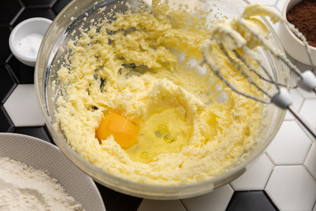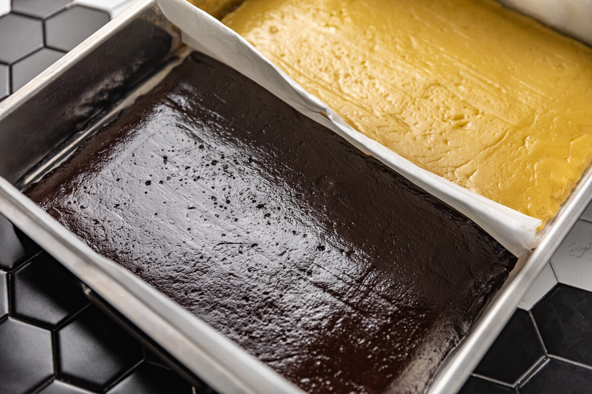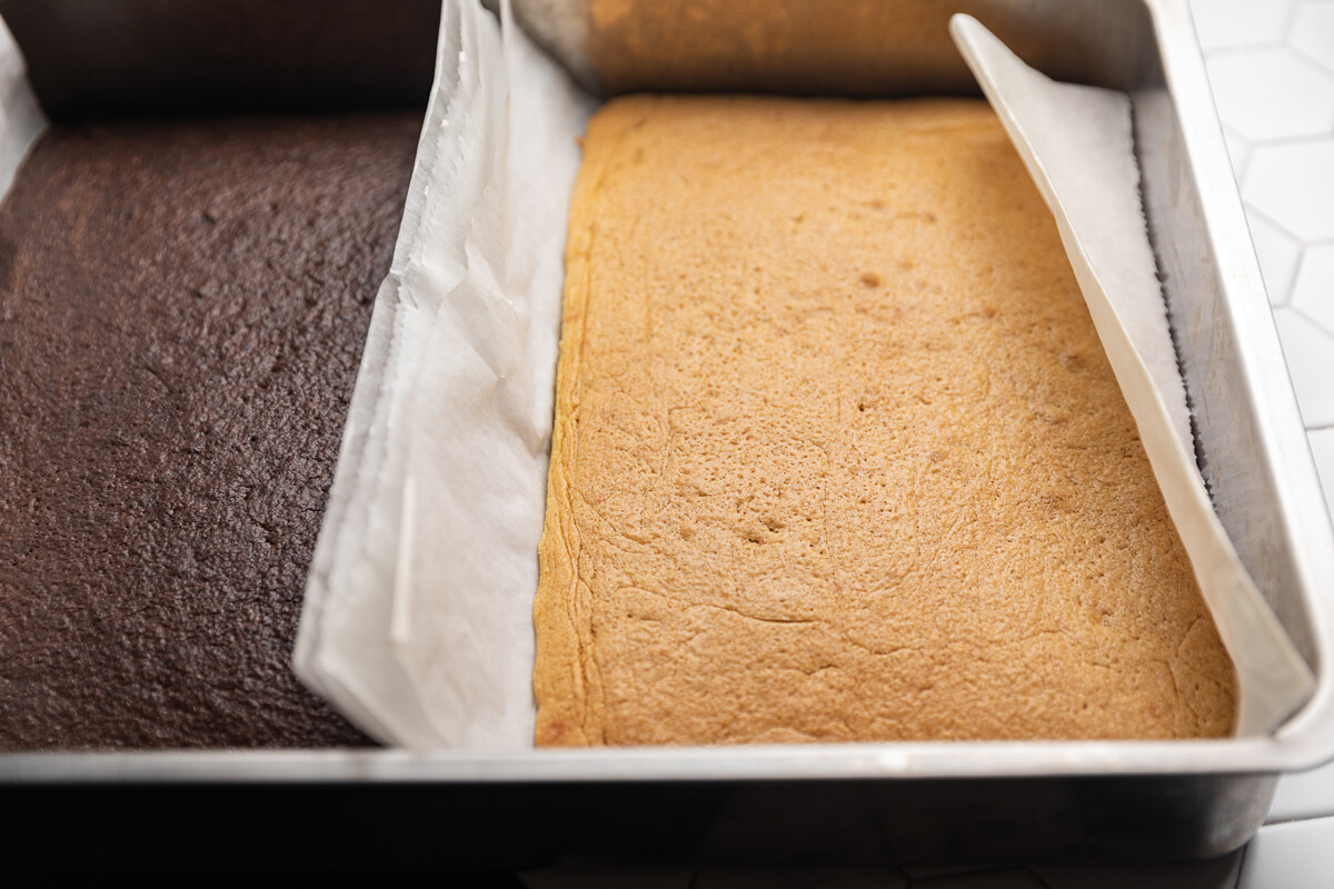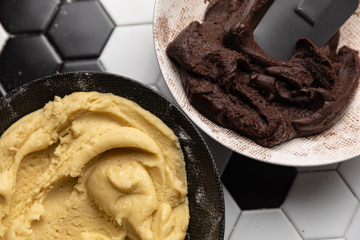 Разделете тестото на две равни елементи. Добавете 25 г брашно към едната част и разбъркайте добре. Добавете 25 г какао на прахуляк към другата половина.