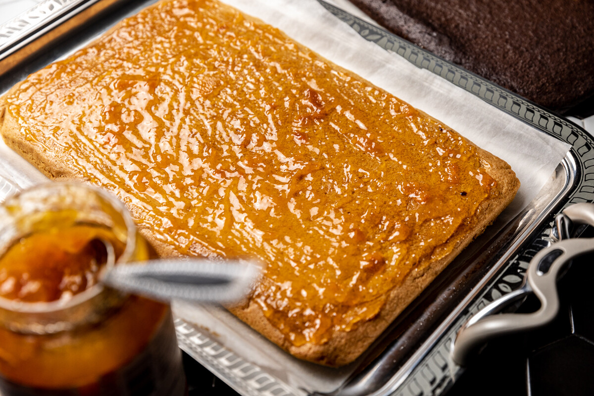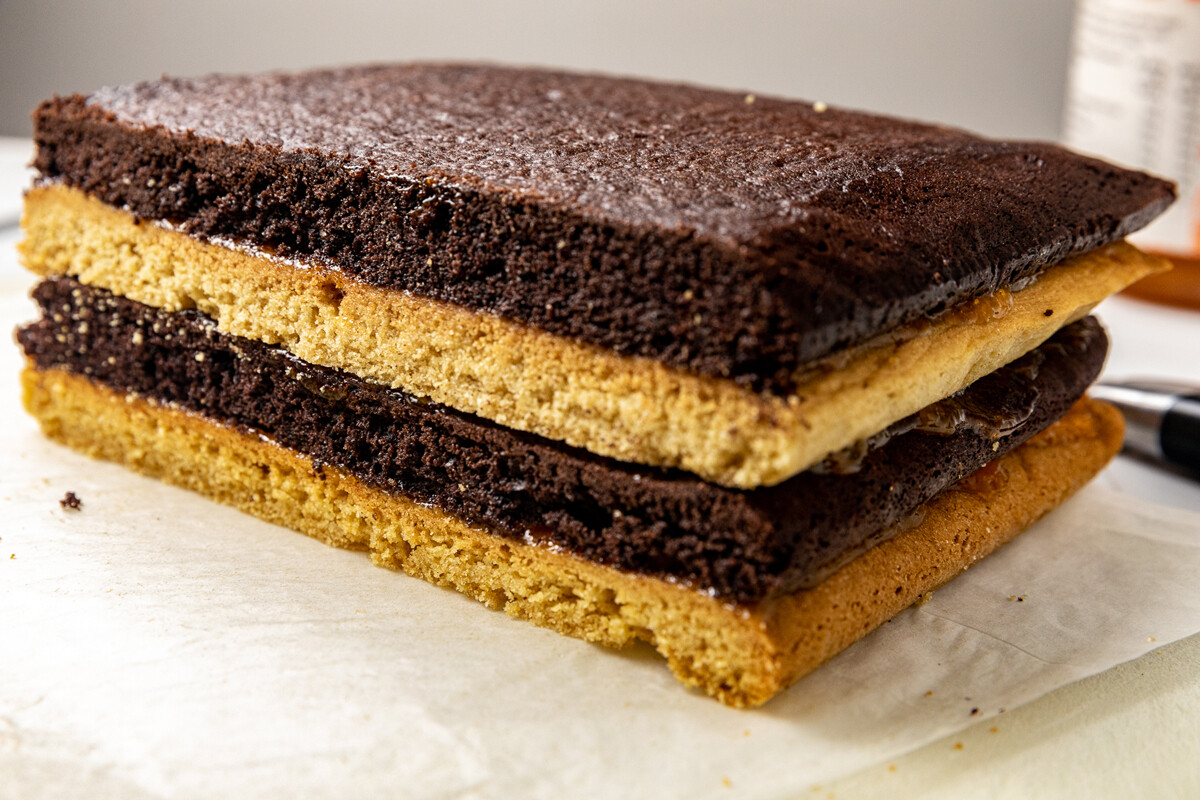 Въпреки че десертът наподобява комплициран, приготвянето му е напълно елементарно. Основата е формирана от ронливи пластове торта. Класическият способ е те да се глазират с ябълково сладко. Но то може да се размени с всяко друго сладко с кисел усет. Аз избрах сладко от кайсии, което е много меко и неутрално на усет. Тортата се получава плътна, само че пухкава. Сладостта на ванилово-шоколадовия сладкиш се компенсира от плодовия заряд.
