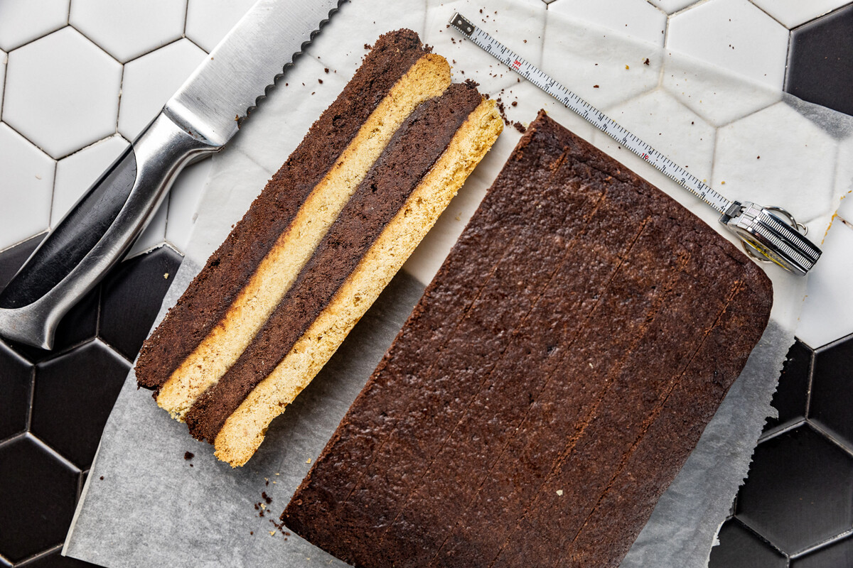 Нарежете 4-те съединени торти на равни ленти. Аз използвах линийка и мерих ленти с дължина 2 см.