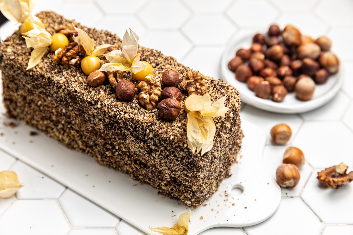 Натрошете останалите краища на блатовете и поръсете с тях завършените торти. Добавих и орехи и лешници.