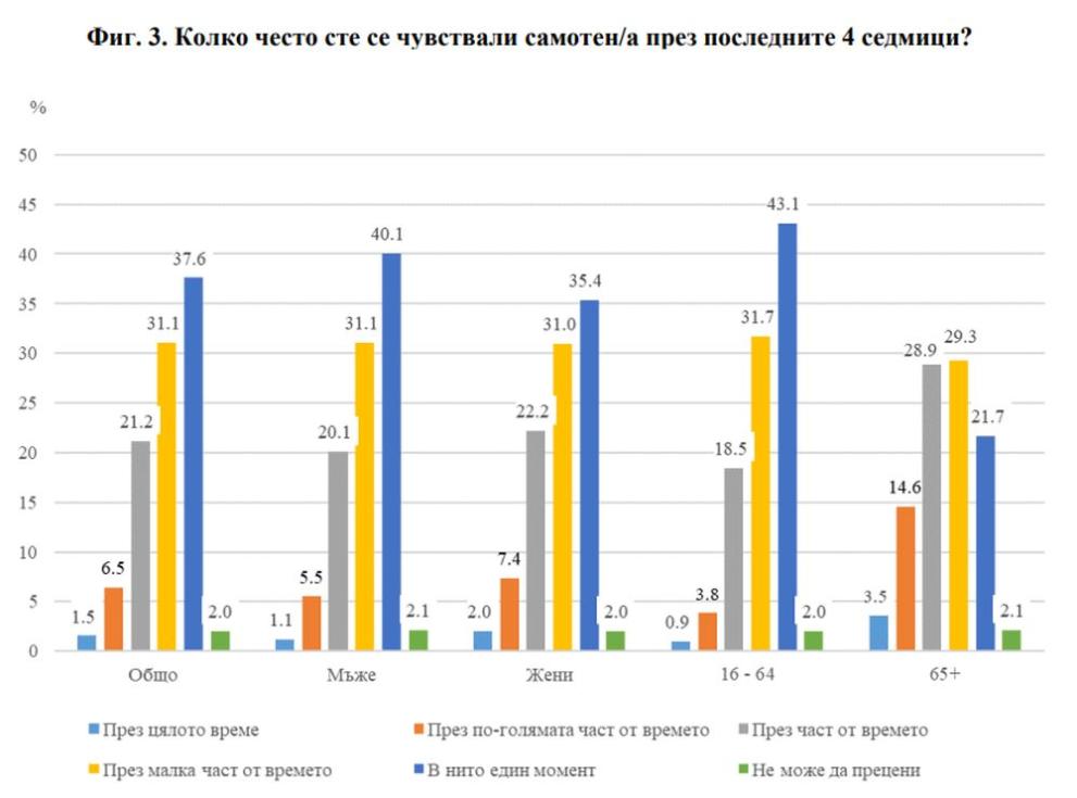 Не са се чувствали самотни в нито един миг 21.7% от възрастните хора. Приблизително два пъти повече, или 43.1% от българите на възраст сред 16 и 64 години, не са изпитвали в никакъв случай самотност през последните четири седмици.