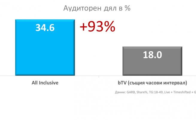 През миналата седмица NOVA регистрира и още един сполучлив старт – в петък се завърна познатият и обичан от феновете сериал All Inclusive с трети сезон. Първият епизод е записал аудиторен дял от над 34%, което е съвсем два пъти повече по отношение на втората телевизия в класацията.
