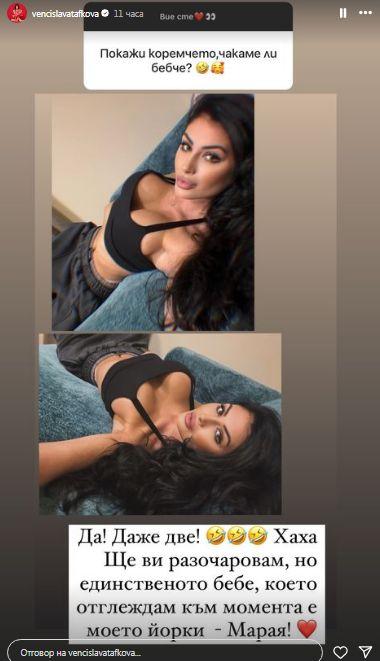 „ Да, очаквам бебе! Даже две! “ Така Мис България Венцислава Тафкова отговори на въпрос на почитател в Инстаграм по отношение на слуховете, че е бременна.