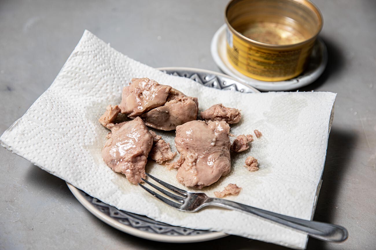 Поставете черния дроб от тресчица на хартия, с цел да попие непотребната лой.