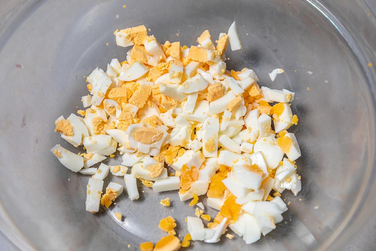 Сварете яйцата и ги нарежете на дребни кубчета.