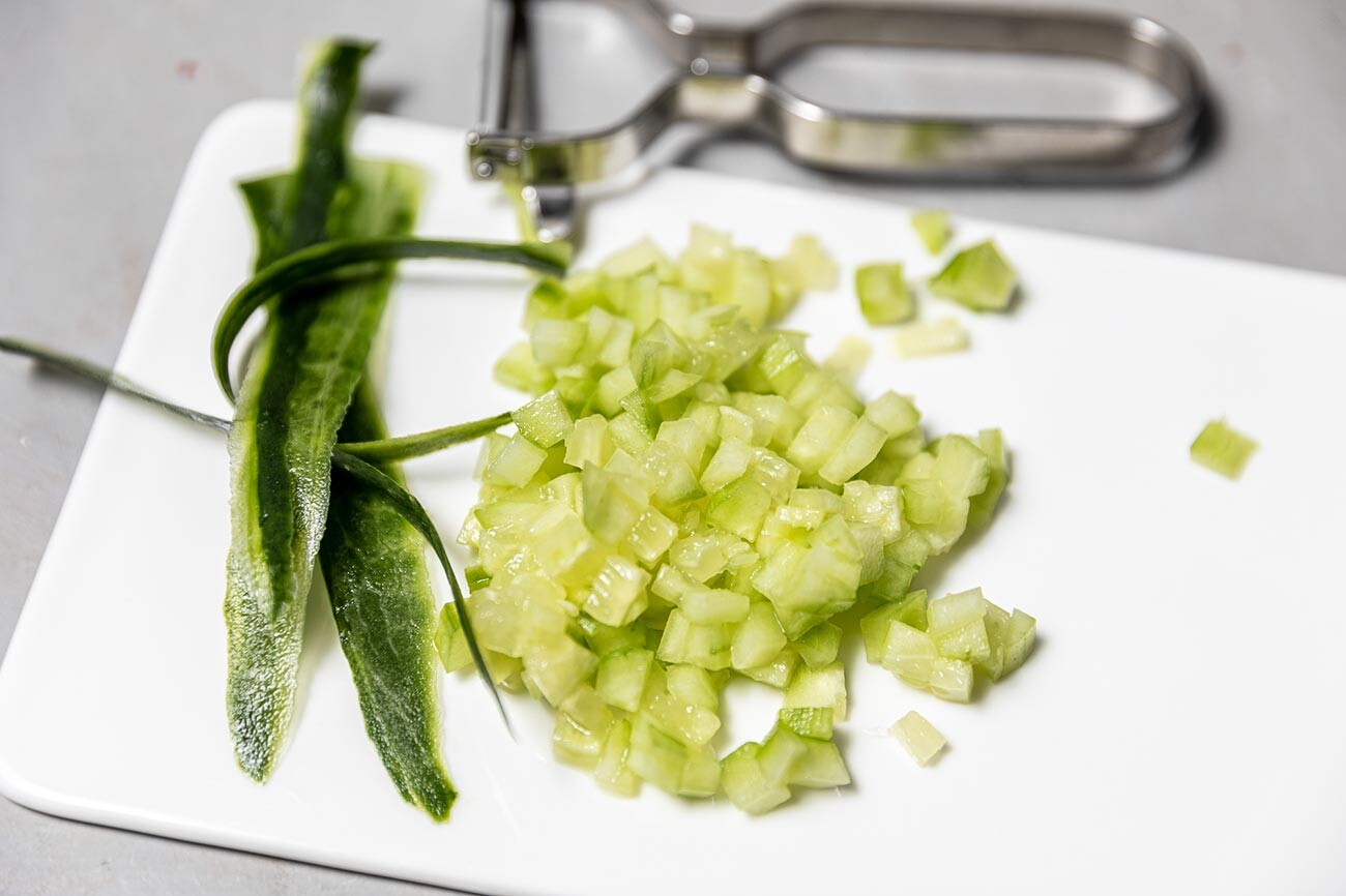 Юлия Мулино Обелете краставицата и я нарежете на дребни кубчета.