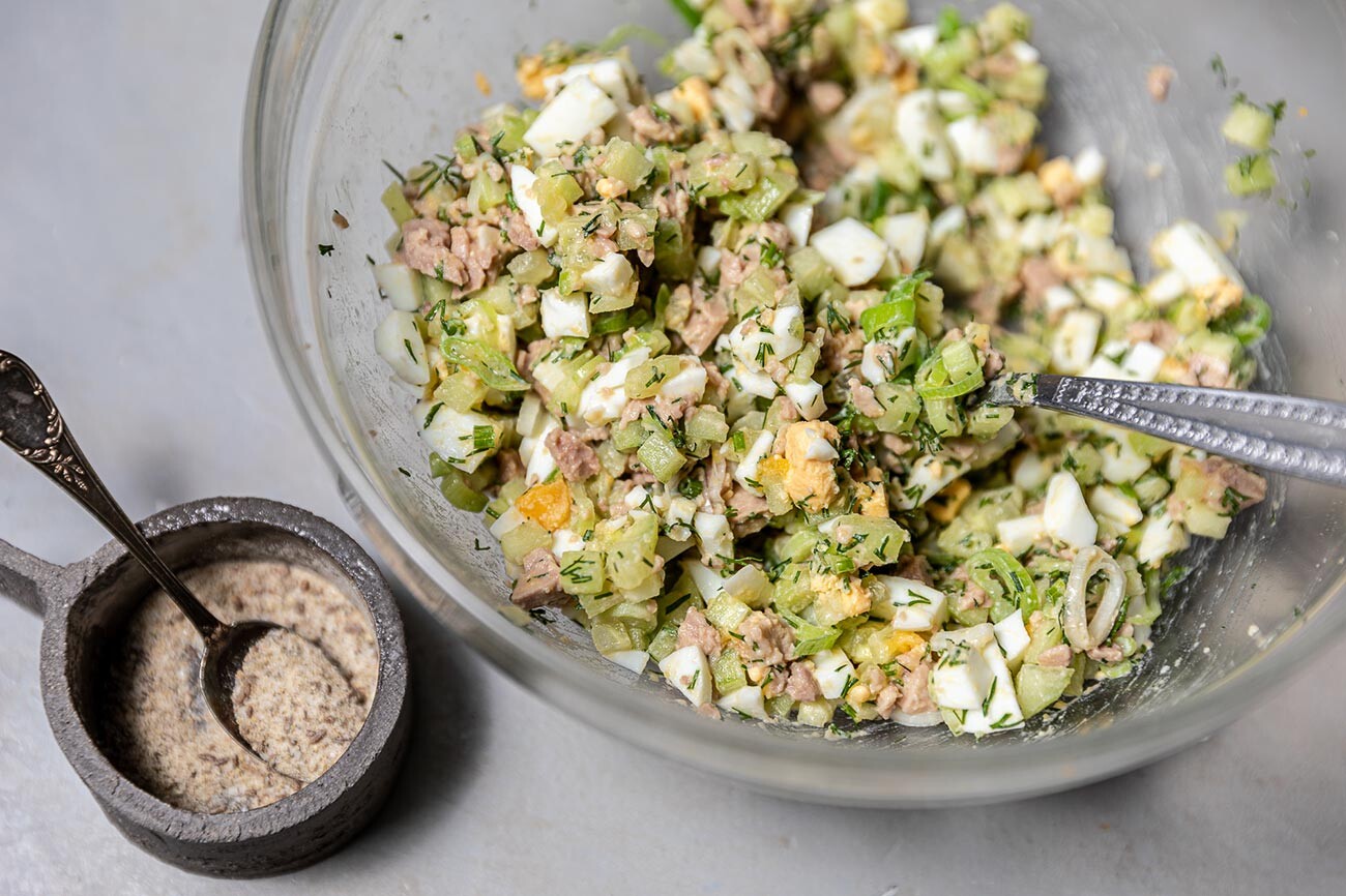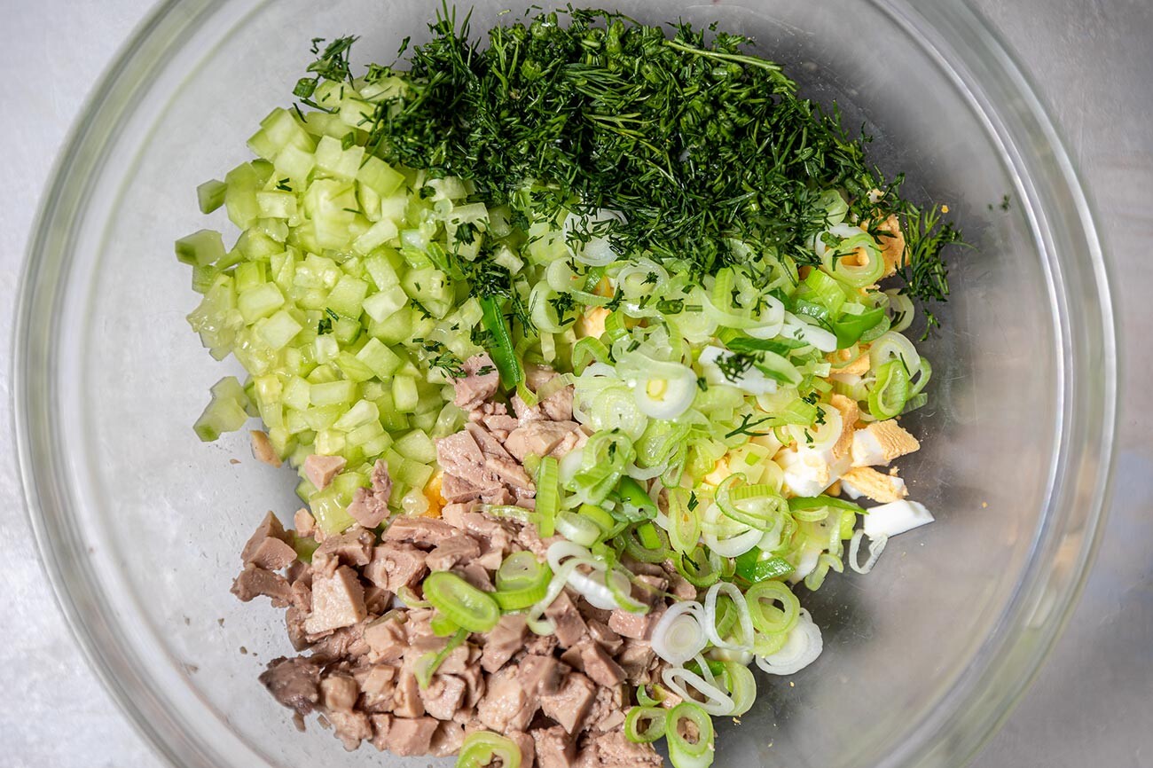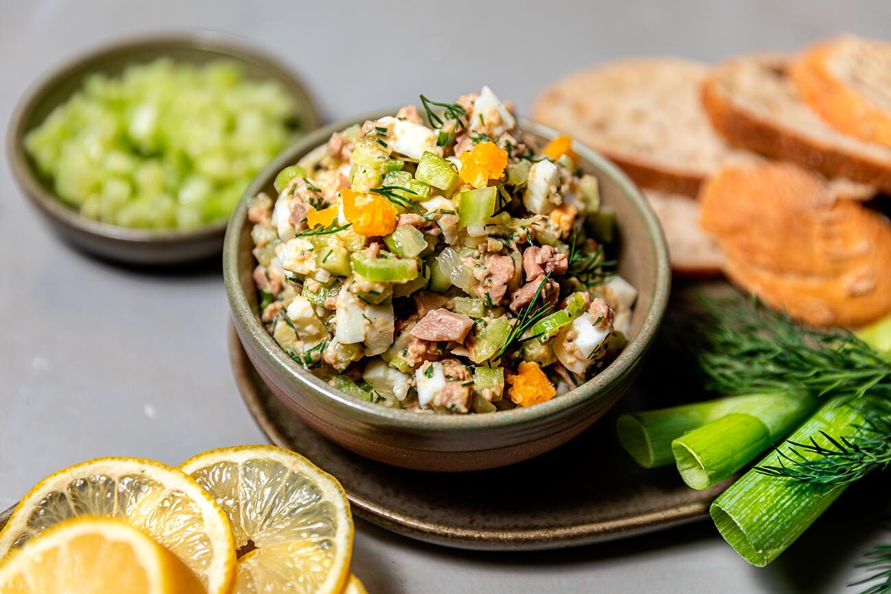 Основните съставки на салатата са консервиран черен дроб от тресчица, яйца, лук и краставица. Има доста разновидности на тази салата с твърдо и крема сирене, които я вършат по-хранителна. От друга страна някои хора прибавят доста свежи зеленчуци като филиз целина, с цел да стане по-лека. Разбира се, с повече зеленини салатата единствено ще стане по-добра. Няма потребност от дресинг, тъй като студеният черен дроб е лоен. Аз се придържам към класическата рецепта. Добавих единствено микс от семена от копър, черен пипер и сол, както и няколко капки лимонен сок и лимонова кора за спомагателен усет.