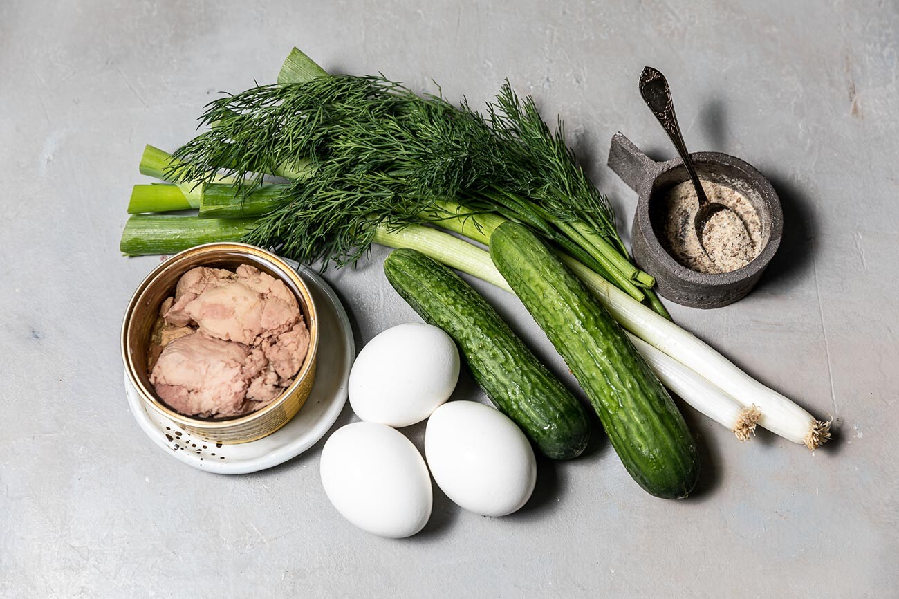 Консервиран черен дроб от тресчица – 200 гЯйца – 3 бр.Краставица – 2 бр. (150 г)Зелен лук – 1-2 стръкаКопър – 50 гМагданоз – 20 гСол, черен пипер – на вкусСемена от копър – на усет (по избор)Лимонов сок и кора – на усет (по избор)Начин на подготвяне: