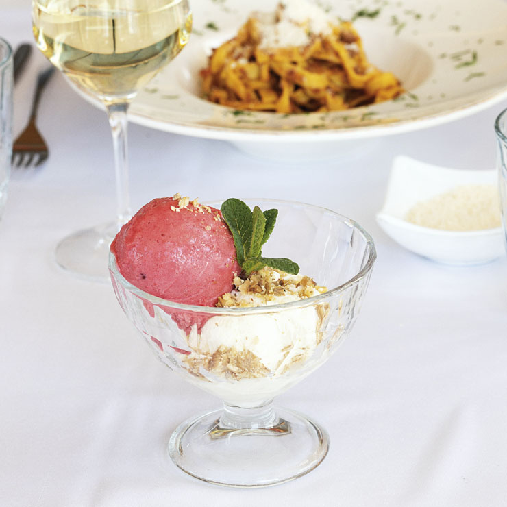 Препоръчваме неговото талятеле, приготвено с рагу от дивеч, и пролетната салата с горгонзола, бейби спанак, розов домат и авокадо.Опитайте още: десертна разновидност от сладоледи с късчета натрошени орехи и два усета – самун, масло и мармалад със сорбе малина.