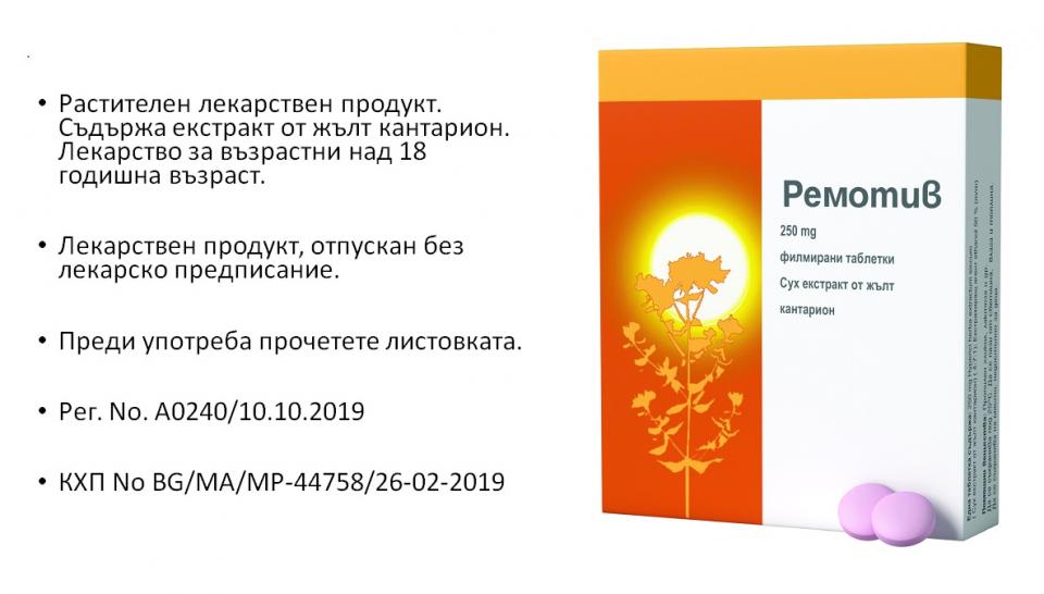 Remotiv съдържа типов дестилат от Hyperici herba (стрък жълт кантарион), който е потвърдено естествено средство, повлияващо позитивно депресивното и лабилно въодушевление, положението на тревога и натегнатост, и даже повлиява сложното заспиване и неспокойния сън.