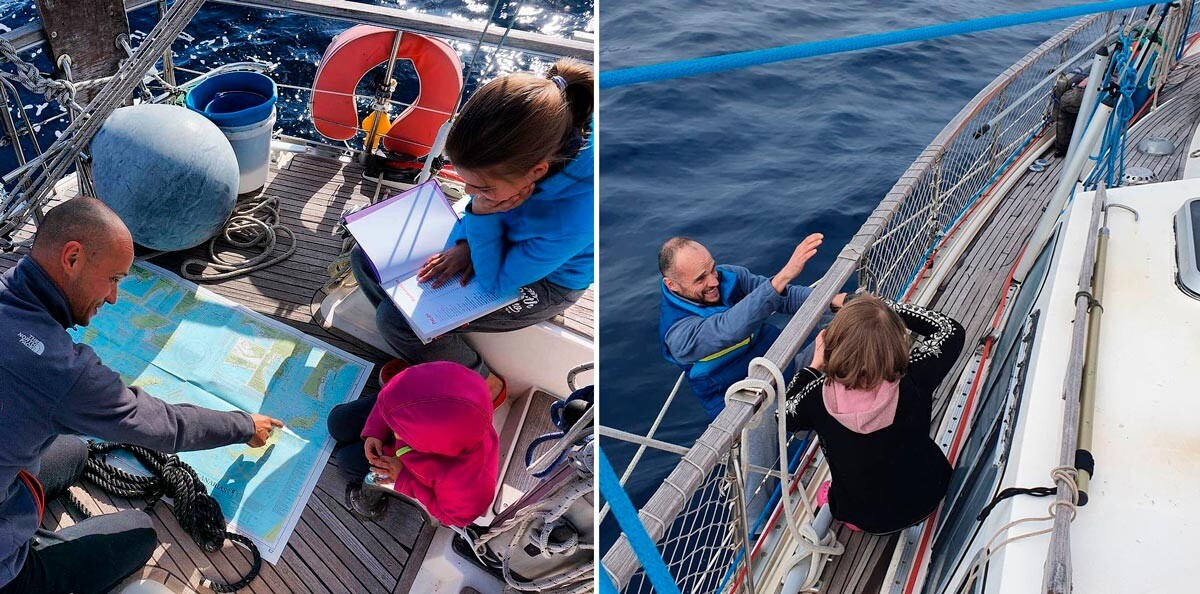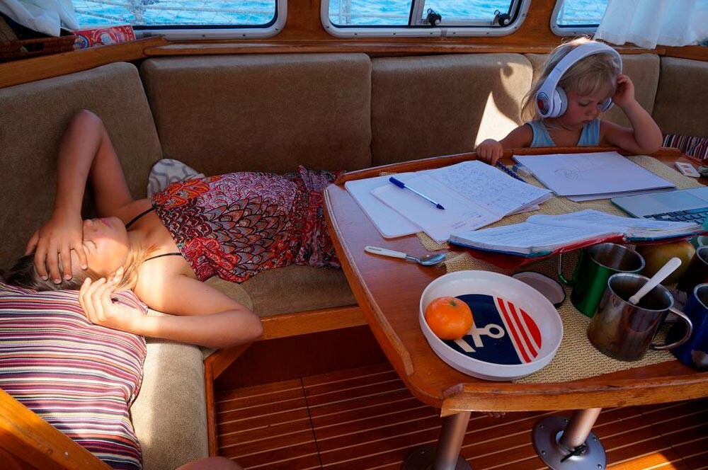 През деня Настя и Лада учат – и двете са задочни ученички в, като употребяват авансово свалени електронни учебници и лекции. През това време Марина се занимава с видеомонтаж, написа публикации или следващата глава от книгата си за тяхното странствуване. Андрей ѝ оказва помощ в това и следи положението на яхтата.