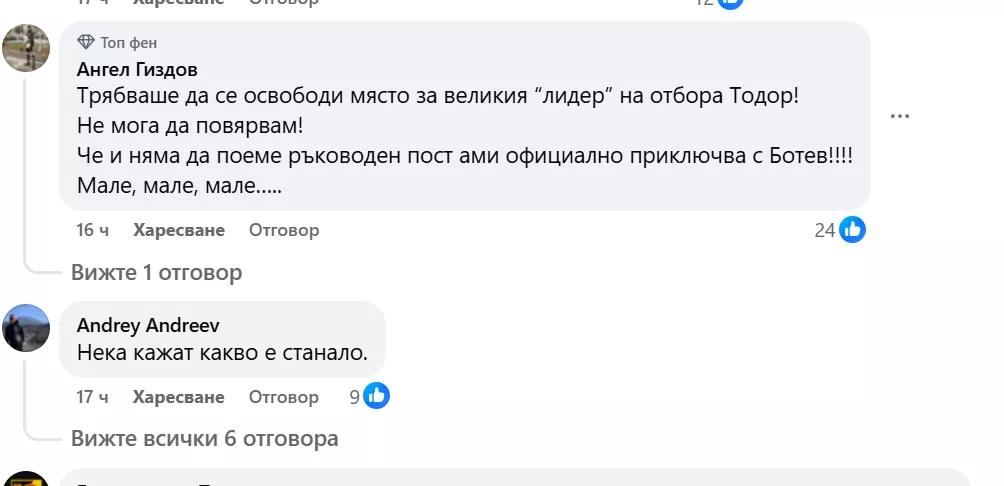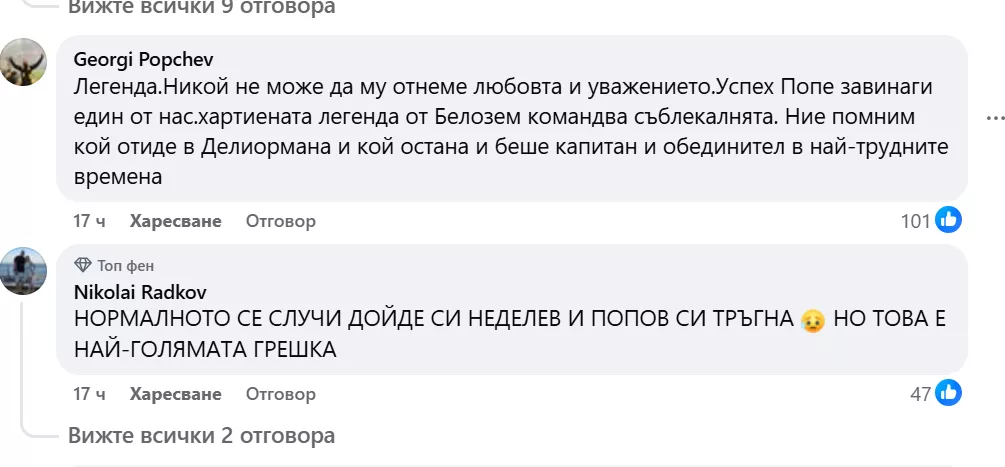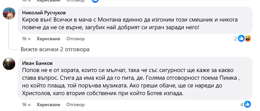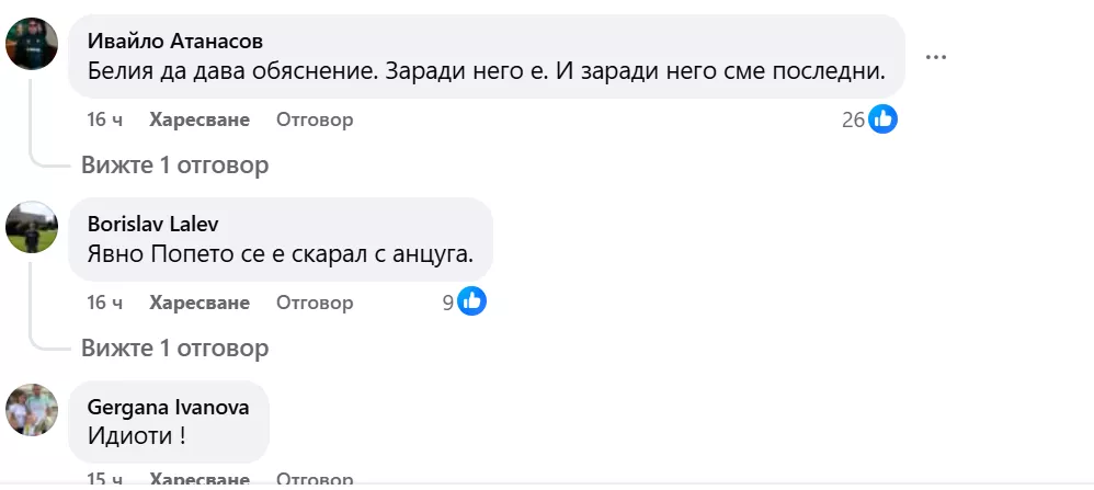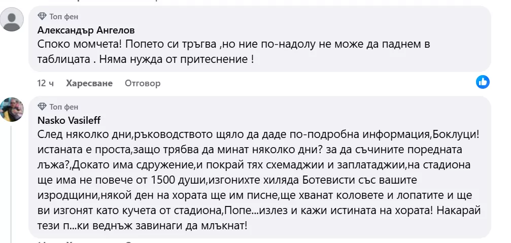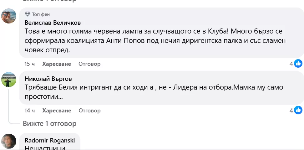 Това още повече отприщя гнева на почитателите, които упорстват за отговори тук и в този момент. Според доста от тях това е съзнателно, с цел да се прикрие същинската причина за раздялата с Попето. Мнозинството от коментиращите акцентират, че футболистът не е от хората, които си мълчат и очевидно това не се е харесвало на Илиян Филипов и управлението. Други пък считат, че виновността е в треньора – Николай Киров – Белия. Някои от почитателите допускат, че всичко това е поради Тодор Неделев – с цел да му се освободи мястото на капитан.