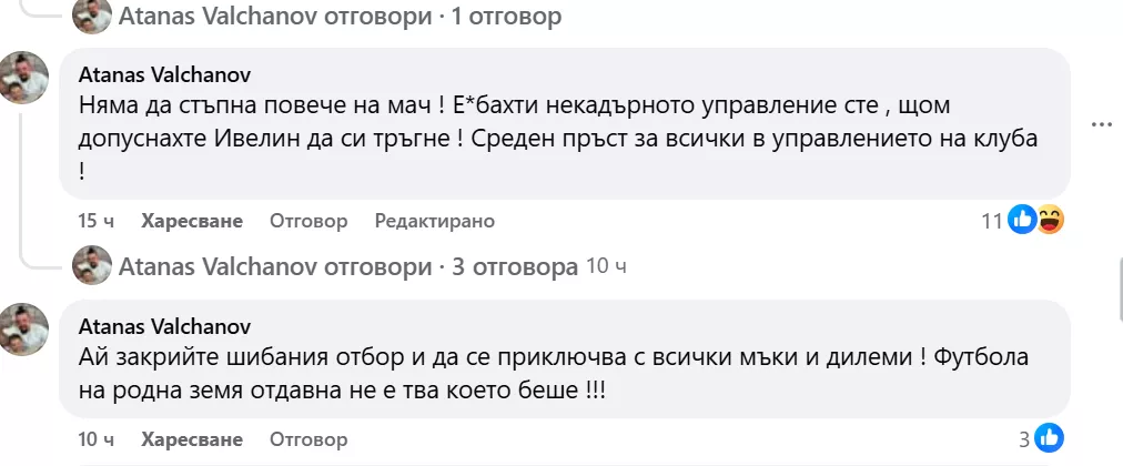 Освен хули и обиди към Илиян Филипов, Николай Киров и управлението на „ канарчетата “, доста от тях се заканват, че няма да стъпят на стадиона, други приканват за пряк протест и търсене на отговорност поради гоненето на Попето. Някои иронично споделят, че каквото и да е прави управлението „ по-надолу в класирането няма по какъв начин да паднат “. В момента клубът заема нежеланото последно 16-то място.