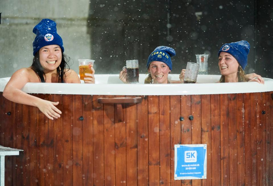 Това обаче не е първият път, когато фенове гледат мач от гореща вана. През февруари ентусиасти на датския Хобро ИК имаха същото наслаждение. Тогава обаче атмосферните условия бяха много по-различни.