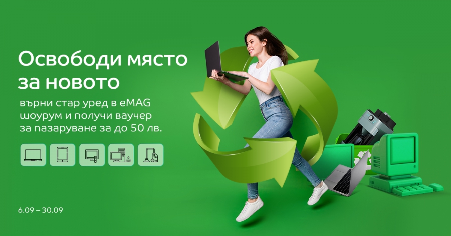 Да се погрижим за околната среда, да се освободим от остарели уреди и да получим ваучери за пазаруването на нови – задачата е допустима с акцията „ Освободи място за новото с eMAG ”. До края на месец септември можем да се включим в нея, като върнем остарял електроуред в шоурума на платформата за онлайн търговия в столичния „ Сердика център ”, равнище 0. Всички участници ще получат ваучери за пазаруване на нови уреди от същата категория и тип на стойност до 50 лева, а събраните уреди ще бъдат излъчени на профилирана организация за оползотворяване на електронно и електрическо съоръжение.