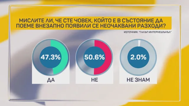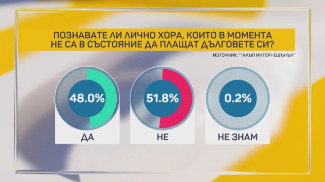 Изследването, поръчано от правосъдното министерство, обаче сочи, че половината българите не могат да посрещнат изключителни разноски, в случай че им се наложи. Всеки втори участник в проучването споделя, че познава хора, които сега не са в положение да заплащат задълженията си.