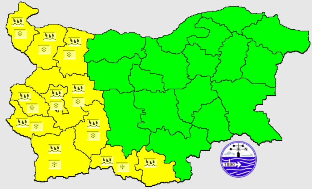 В страната преди обяд в западните, а след обяд и в източните региони от страната вятърът ще е от запад-северозапад, сдържан до мощен и с него ще нахлува леден въздух. С понижението на температурите на доста места в Югозападна България и Предбалкана дъждът ще премине в сняг и ще се образува нова снежна завивка. В Горнотракийската равнина и Източна България преваляванията ще са от дъжд. Вечерта от запад преваляванията ще отслабват, тук-там краткотрайно и ще стопират. Максималните температури ще са най-вече сред 3° и 8°, малко по-високи в Югоизточна България, в София – към 4°.