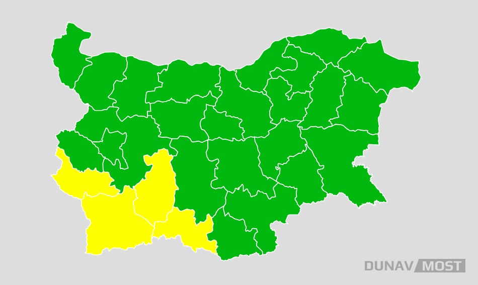 Жълт код за обилни превалявания от дъжд е в действие за 5 декември (петък), оповестиха от Националния институт по метеорология и хидрология (НИМХ). Предупреждението за евентуално рисково време визира областите Кюстендил, Благоевград, Пазарджик и Смолян, където се чакат интензивни превалявания.