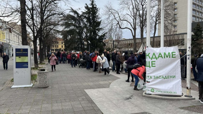 Дълги опашки за безвъзмездни дръвчета се извиха в центъра на Бургас. Стотици хора се събраха в региона към Часовника до постройката на Община Бургас, с цел да получат безвъзмездни фиданки.