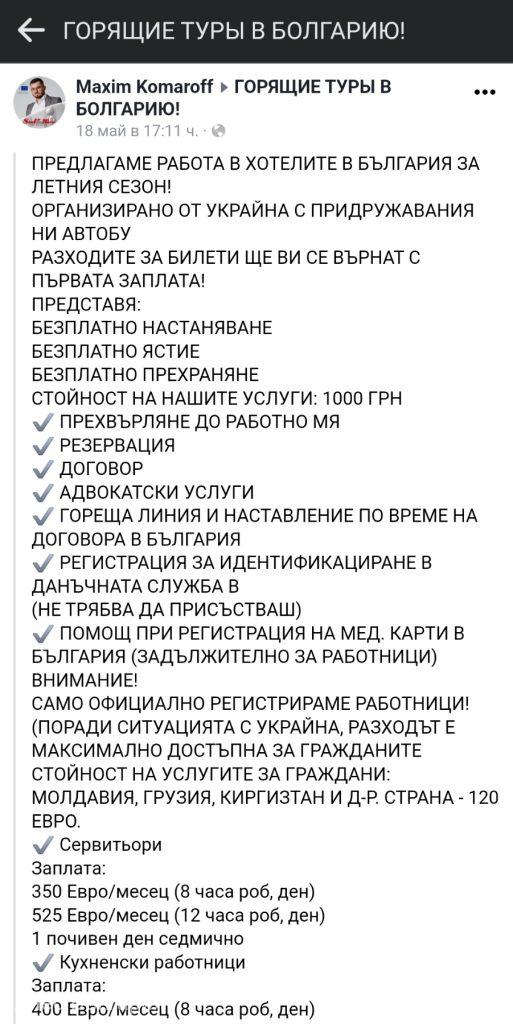 На 1 април Комаров е трансформирал името на групата „ Аренда для Украинцев в Болгарии и помощь в статусе беженца! “ на „ Бесплатные отели в Болгарии для Украинцев! Безкоштовні готелі в Болгарії! “.