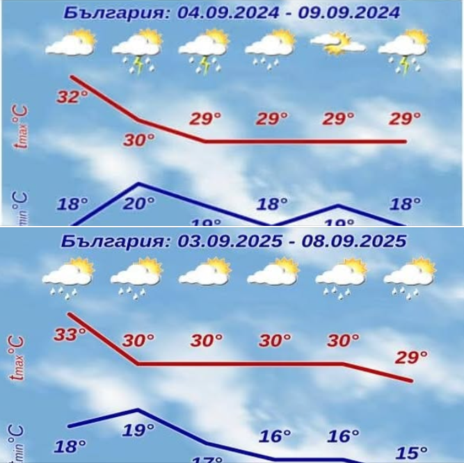 " Сравняваме седмичната прогноза на Национален институт по метеорология и хидрология от предходната и тази година – времето е съвсем същото, че дори и оптималните температури съответстват... ", акцентират загадъчно синоптиците.