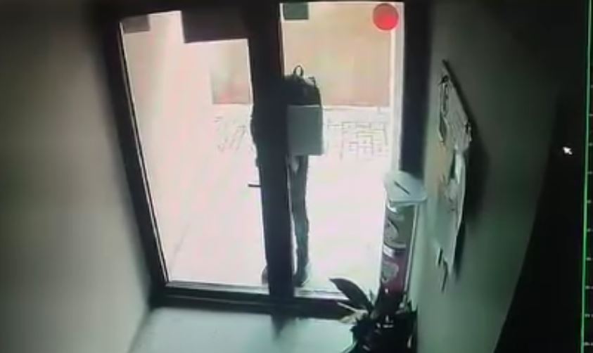 На тях се вижда мъж, който се пробва да отключи входната врата на постройката.