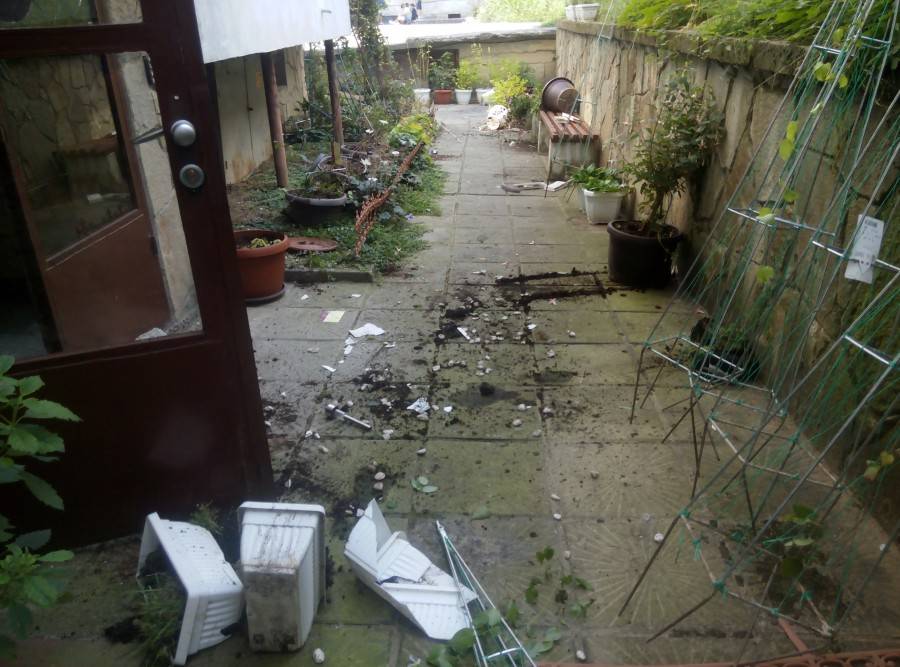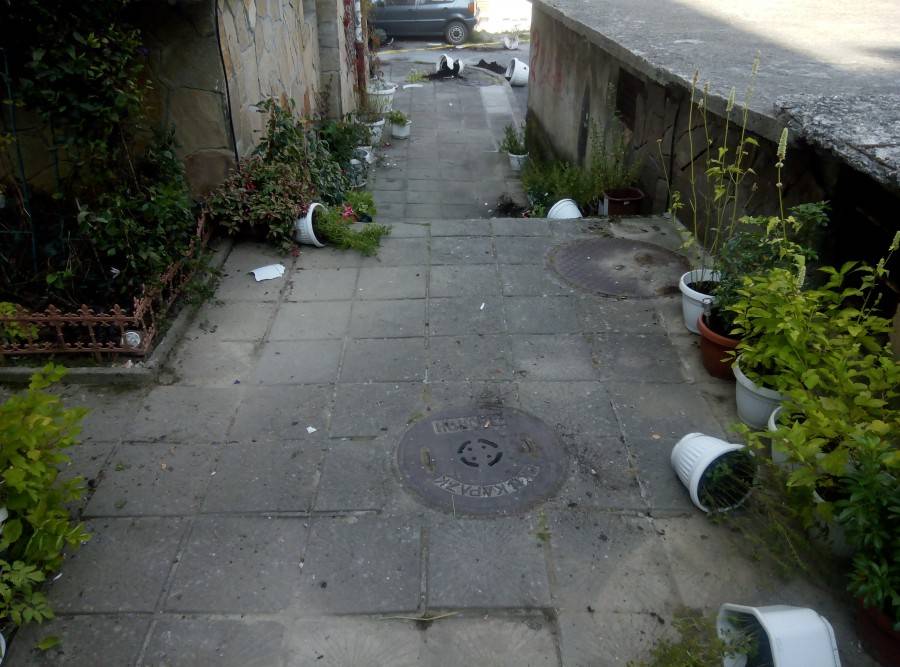 Входът на блока е трансфорат от татко му в цветна градина с десетки красиви цветя, за които се поставят специфични грижи. Синът не ги пожалил. Ритал и трошил дълго време, повреждайки към 24 саксии, друга форма и величина, пет железни арки за цветя, две култивиран слънчеви лампи и стъклото на входната врата на блока.