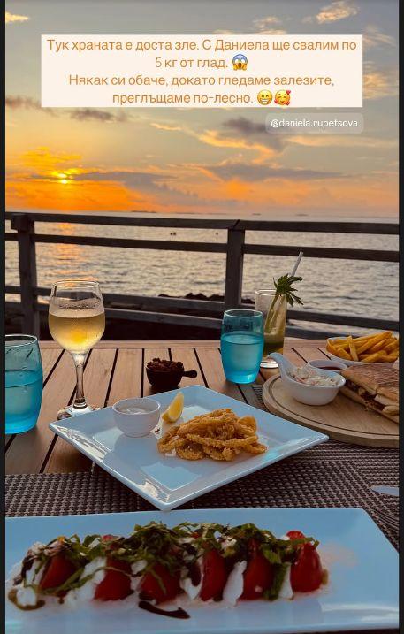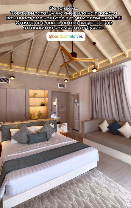 Тя не пропусна да изтъкне, че почивката на Малдивите им е излязла по 10 000 лв. на човек и макар " скромната " сума, двете по никакъв начин не са удовлетворени от това, което са получили отсреща. Ризортът е избран като междинен клас, плажът – като по-мизерен от този на Китен, храната – безвкусна и третокласна, а ресторантът наподобява на крайпътна сладкарница.