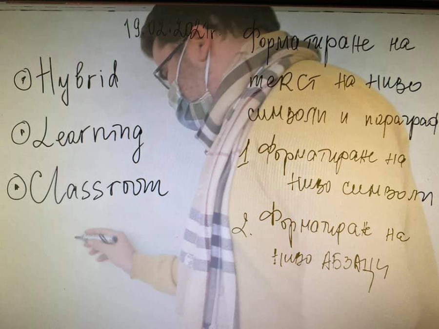 В момента на територията на нашето учебно заведение сме подготвили с нашите сътрудници от Майкрософт България и Асбис България една класна стая с новаторско съоръжение, която се базира не на познатите Microsoft Teams екипи, а на Microsoft Teams Rooms. Използвайки широкоформатна и фокусирана върху наличието (content) камери, както и особено устройство за делене на облиците, се реализира резултатът на системата. Всъщност това, което съумяваме да създадем, е учителят свободно да употребява бялата дъска в класната стая, учениците да виждат дъската, макар съществуването на човек пред нея, и, несъмнено, написаното на нея. Тоест учителят или най-общо казано този, който написа, става транспарантен и не пречи на учениците да видят в действително време какво има на нея. Учениците, които са онлайн, могат да работят по едно и също време с децата в клас, като виждат на екрана си и бялата дъска, и учителя от класната стая. Разбира се, има опция единствено с един клик на учениците да се показа друго наличие, друго от бялата дъска, като същото по едно и също време се проектира на децата в класната стая.