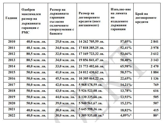 От 2016 година има забележителен спад във връзка с осъществяването на контрактувания с банките размер на държавни гаранции. Затова общият размер на държавните гаранции за 2021 година и 2022 година беше понижен от до 50 млн. лева на до 40,0 млн. лева Очакваният брой заеми през 2023 година, е 800, в това число за такси за образование и за прехрана.