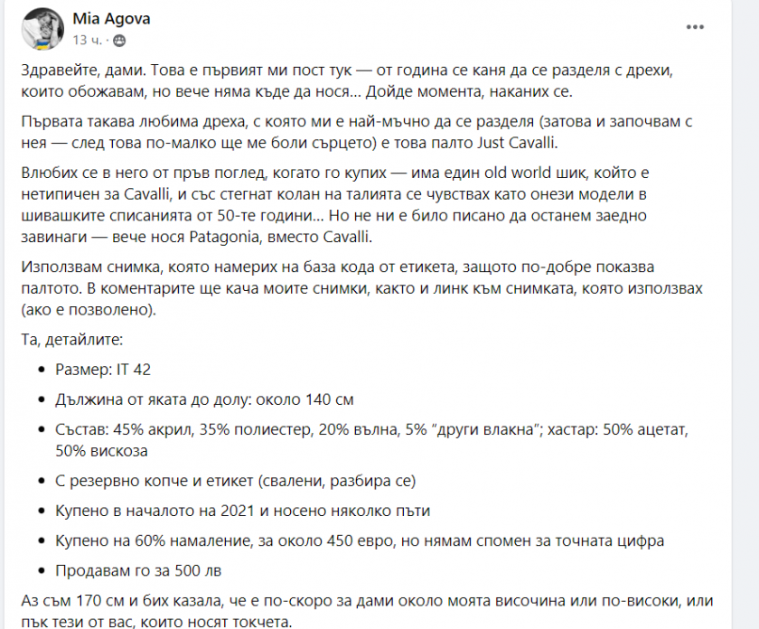 Дъщерята на Асен Агов, която е била началник на PR-отдела на криптопирамидата " Nexo ", Миа Агова трескаво се зае да разпродава дрешника си с първокласни облекла, видя Lupa.bg. Дамата разгласи за обмен носено палто на Кавали за скромната сума от 500 лв.. Миа твърди, че дрехата е обличана единствено няколко пъти и поради това се разделя с нея. В обществените мрежи разясняват, че по-скоро я е боязън от бъдещи проблеми и гледа да се отърве от част от морковите си одежди, а бижутата да скрие на несъмнено място. Ето какво написа Агова, която е работила за Nexo от април 2020 година до юни 2021 година, след което още веднъж се занимава с пиарстване, само че в друга компания в бранша на криптовалутите и технологиите – " DappRadar ".