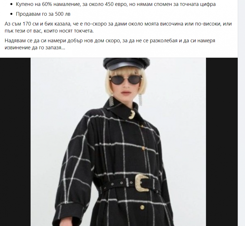 Използвам фотография, която открих на база кода от етикета, тъй като по-добре демонстрира палтото. В мненията ще кача моите фотоси, както и линк към фотографията, която използвах (ако е позволено).