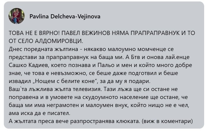 Скоро по-късно дъщерята на Павел Вежинов - Павлина Делчева, изгря във Facebook с безсрамен коментар, в който подкара с най-грозните думи детето. „ Л*йненце “ и „ малоумник “ са единствено част от епитетите, с които наследницата на писателя се впусна да брани ексклузивността си към рода. Цветното излияние, в което не липсват правописни неточности, бързо набра известност измежду съидейниците и приятелите на Павлина, които с ненаситност се включиха в унижението на детето. Към момчето, което просълзи феновете на предаването с рецитала си, бяха отправени завист, цветущи закани и груби обиди.
