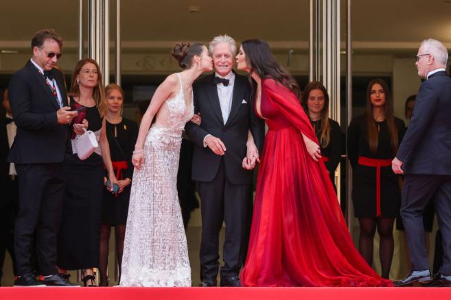 78-годишният Дъглас от своя страна носеше типичен черен костюм, бяла риза и черна папийонка. Той изглеждаше допустимо най-щастлив, до момента в който излизаше на килима със своите дами.