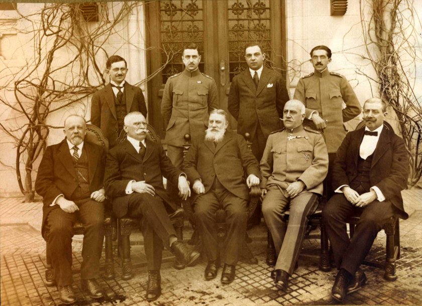 Българската делегация в Брест-Литовск е водена от премиера Васил Радославов (седналият в средата с брадата)