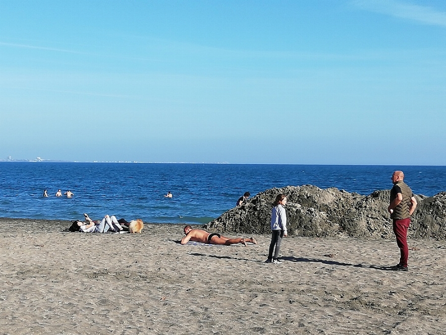 Датата е 9 ноември 2019 година, а мястото - плажната линия на Бургас. Много хора избраха да бъдат навън, само че не просто в парка, а на плажа. По-смелите дори плуваха в морето.