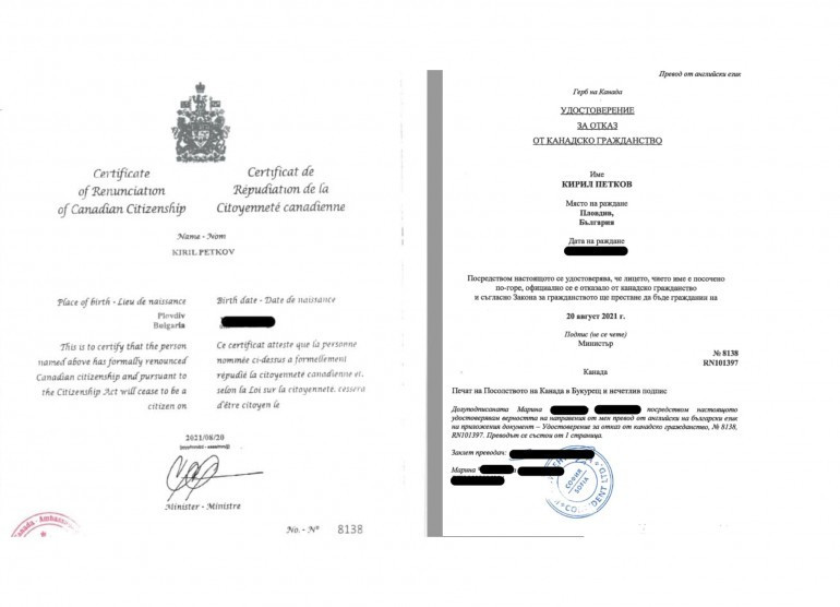 Датата на документа, че министърът от първия длъжностен кабинет не е канадец, е с дата 20 август Кирил Петков е показал в Конституционния съд в инструкции период - 9 октомври 2021 година документа, удостоверяващ, че към този момент не е жител на Канада. Това оповестяват от „ Продължаваме промяната “. Административният акт, получен по пощата, носи дата 20 август 2021 година и удостоверява, че към тази дата Кирил Петков не е жител на Канада, прибавят от партията. Основното, което излиза наяве от акта обаче е, че Петков не е разполагал с сходен към датата 12 май, когато стана министър на стопанската система. Преди това той е подписал декларация, че дава отговор на условията за министерски пост – в това число да няма друго поданство с изключение на българско.