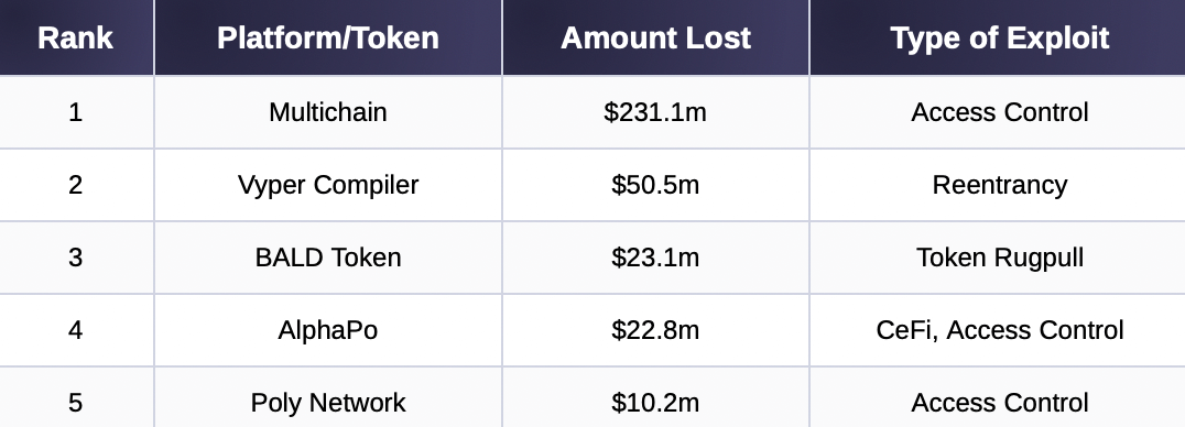 Начело на листата е експлойтът на Multichain, който аргументи загуби в размер на $231.1 милиона заради уязвимости в контрола на достъпа. Компилаторът Vyper Compiler означи загуби от $50.5 милиона, а токенът BALD претърпя загуби от $23.1 милиона заради rug pull.