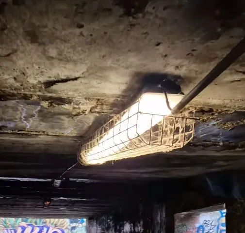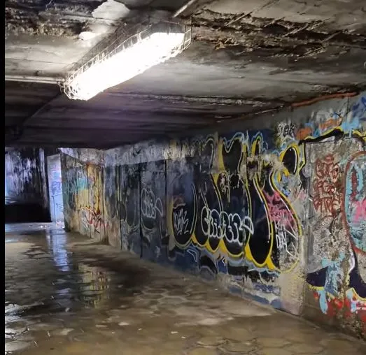 От публикуваните във Фейсбук фотоси се вижда, че положението на подлеза е плачевно. По тавана личат големи компрометирани сектори, в които арматурата е съществено оголена. През мазилката даже пропива вода, която образува локви по пода. Капките падат в рискова непосредственост до кабели и осветителни тела.