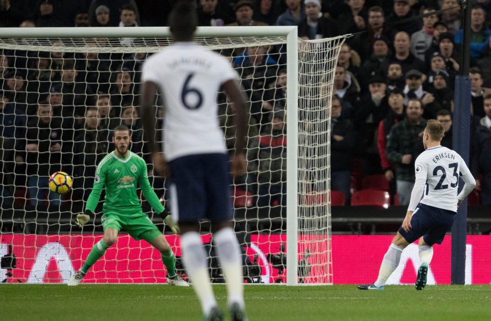 Давид де Хеа знае тъкмо какво следва да се случи. Ериксен приключва тъкмо с левия крайник и Тотнъм повежда с 1:0. Часовникът едвам е отмерил 11-ата секунда.