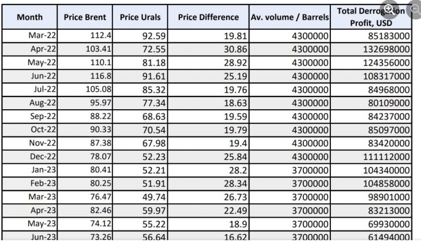 От началото на войната в Украйна и глобите към Русия, съветският нефт стартира да се търгува доста по-евтино от останалия нефт. Руският нефт е вид Urals и неговата цена по месеци е нанесена в третата колонка. Във втората колонка е цената на нефт вид Brent, който купуват останалите страни. В четвъртата колонка е разликата в цената сред брента и съветския уралски петрол в американски долари за един барел. За първия месец да вземем за пример е 19.81 на барел - за месец март 2022 година. В петата колонка е междинния размер барели за 2022 и 2023, които е купувал