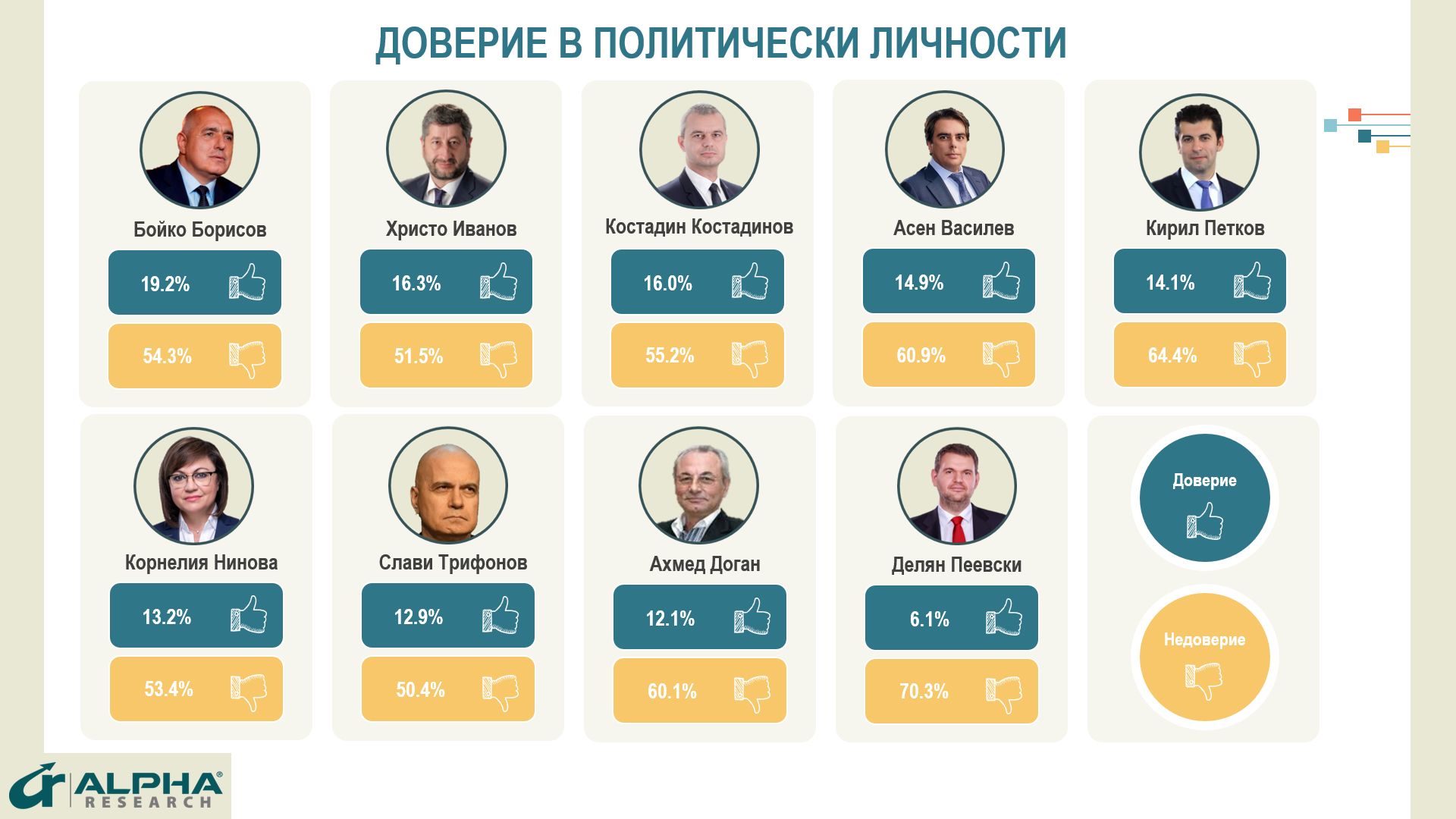 На този декор ръководителят на ГЕРБ Бойко Борисов стои с дребна преднина на фона на съвсем равните дялове на доверие в Христо Иванов (ДБ) и Костадин Костадинов (Възраждане). При Костадинов делът на отрицание е по-висок от този на Борисов и Нинова, само че не и колкото при Асен Василев и Кирил Петков - сред 61 и 64% съмнение.