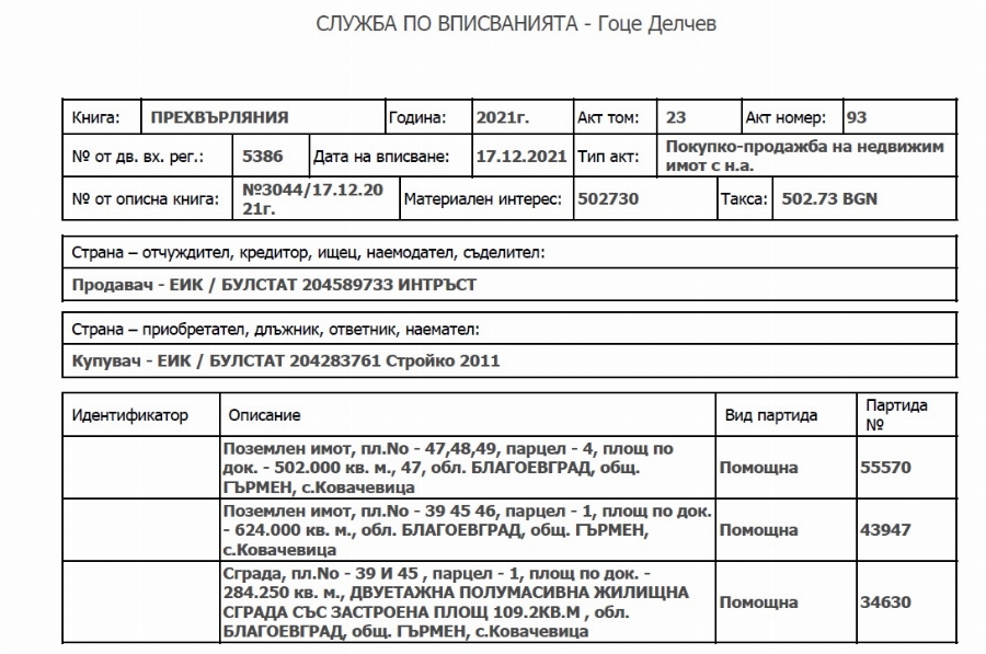 Само в продължение на три-четири дни предходната седмица – сред 14-ти и 17-ти декември, " Интръст " т.е. Пеевски е продал близо 30 парцела на обща стойност близо 5 млн. лв.. Няколко от тях са в Ковачевица, община Гърмен.
