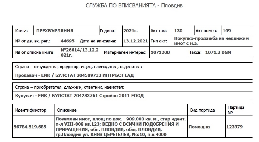 Преди месец Actualno.com откри, че пътят на закритите му предходни компании и парцелите от тях водят към " Интръст ": Как Пеевски се снабди с съвсем цяло село - архитектурен резерват. Сега, макар обстоятелството, че сдружението е в българския лист " Магнитски " (бел. ред. - описът демонстрира, че с включените в него е рисково да се прави бизнес, тъй като който го прави, може да бъде изключен от Съединени американски щати от всевъзможни финансови интервенции с американски долари), то се разпорежда с парцели - нещо, което подсказа в. " Капитал ".