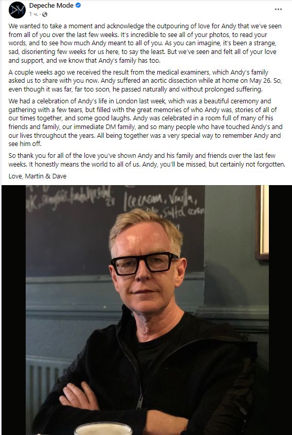Преди няколко седмици получихме резултата от медицинските експертизи, който фамилията на Анди ни помоли да споделим с вас в този момент. Той претърпя скъсване на аортата, до момента в който си беше вкъщи на 26 май. Така че, макар че беше прекомерно рано, той си отиде от естествена гибел и без дълготрайно страдание”, пишат от " Депеш мод ", представени от NOVA.