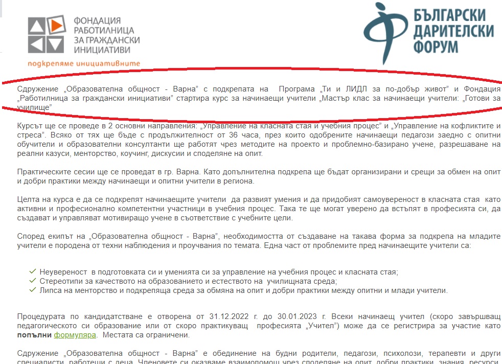 В края на по-миналата година сдружението започва плана си „ Мастър клас за начинаещи учители. Готови за учебно заведение “. Обучението на младите педагози ще е в две посоки – за ръководство на класната стая и образователния развой, както и за ръководство на споровете и напрежението, излиза наяве от известие до медиите.